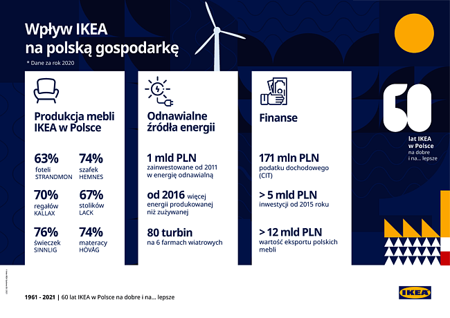27 stycznia 1961 r. Ingvar Kamprad złożył pierwsze zamówienie na zakup mebli wyprodukowanych w polskiej fabryce. Dzisiaj prawie 20% produkcji IKEA pochodzi z naszego kraju.